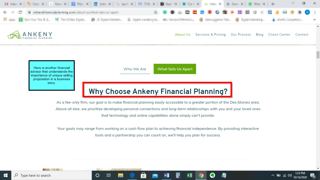 Here is another financial advisor that understands the importance of a unique selling proposition in a business story.