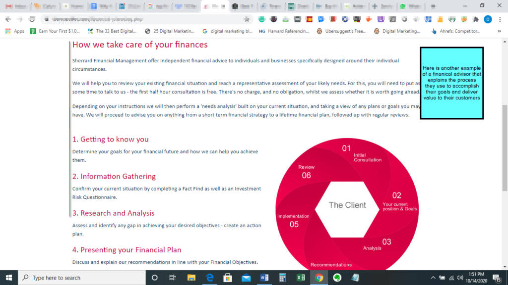 Here is another example of a financial advisor that explains the process they use to accomplish their goals and deliver value to their customers.