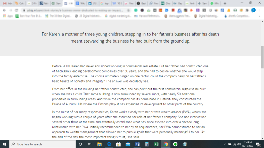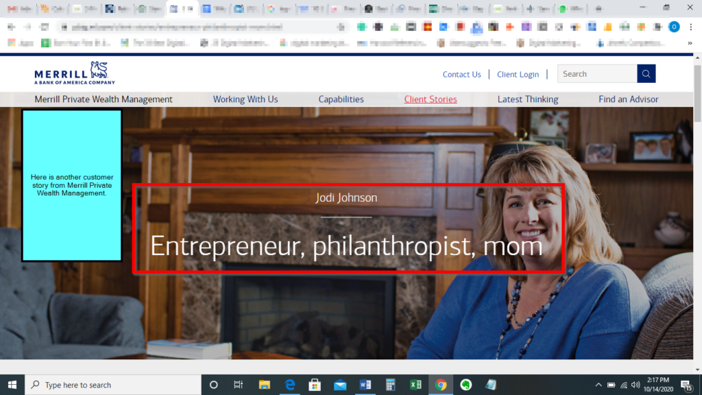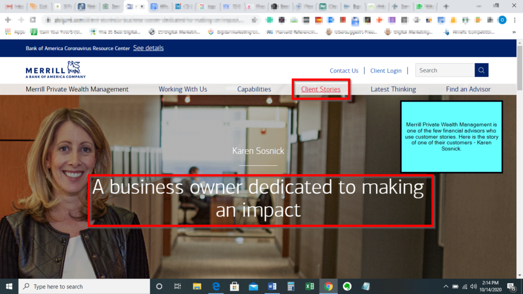 Merrill Private Wealth Management is one of the few financial advisors who use customer stories. Here is the story of one of their customers – Karen Sosnick.
