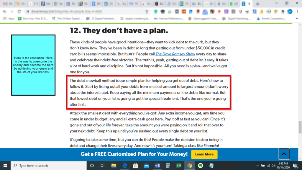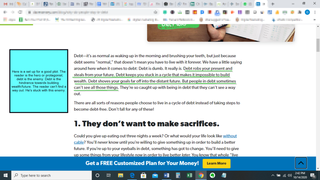 Here is a set up for a good plot. The reader is the hero or protagonist; debt is the enemy. Debt is the hindrance to building wealth and the dream future. The reader can’t find a way out. He’s stuck with this enemy.