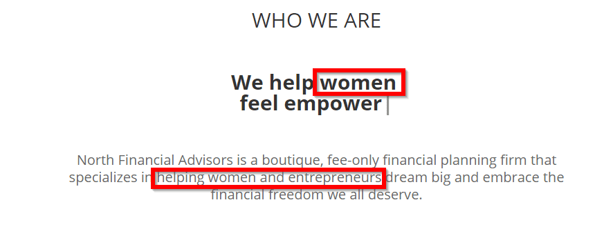 North Financial Advisors is an advisory firm that focuses exclusively on the financial planning needs of women, especially women entrepreneurs.
