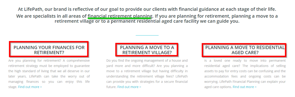 They also have great copywriting on their homepage that highlights the three major services they offer: planning finances for retirement, planning a move to a retirement village, and planning a move to residential aged care.