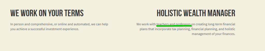 “We work with teachers and professors on creating long-term financial plans that incorporate tax planning, financial planning, and holistic management of your finances.”