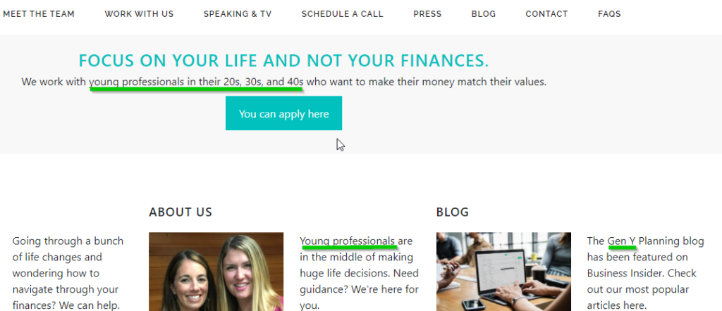 Gen Y Planning is another financial advisor that niches down by demographics; in this case, the focus is on Gen Y professionals.