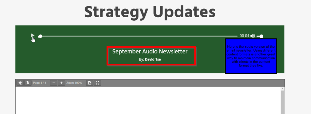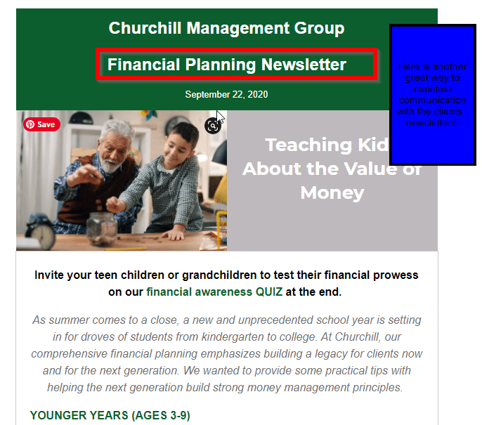 Church Hill also has an audio version of their newsletters. Once again, we must not limit content marketing to a single content format. Instead, a good financial advisor must combine different content formats – text, audio, video, infographics, etc.