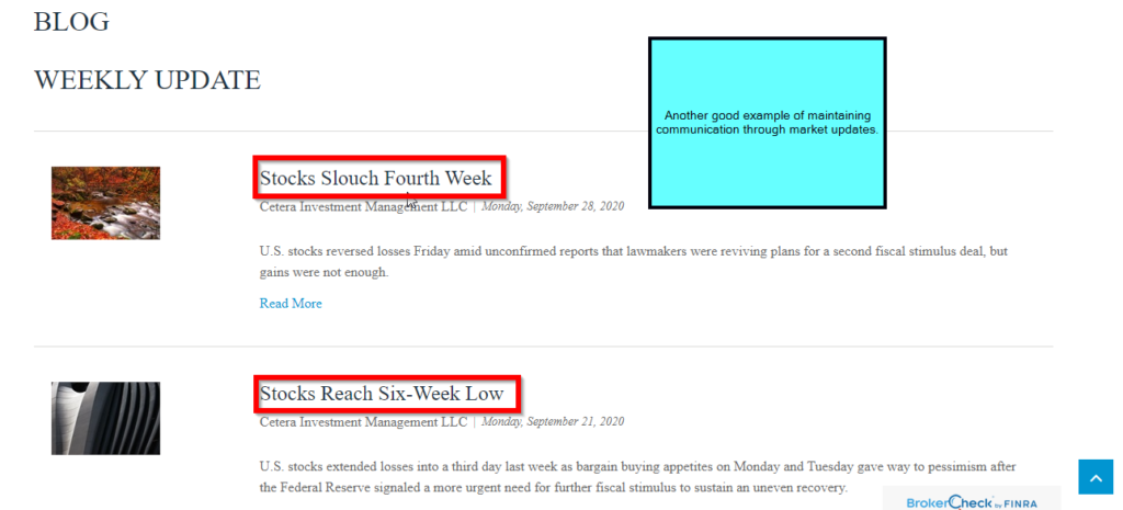 The above financial advisors are doing a great job using content marketing to manage clients’ expectations, communicate their values, and stay in touch with their clients.