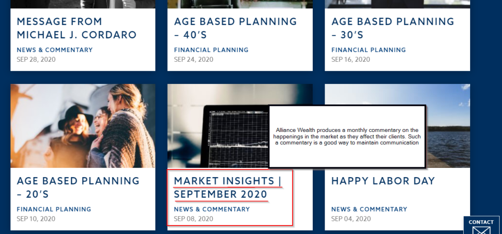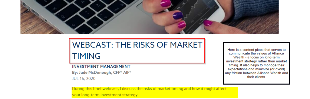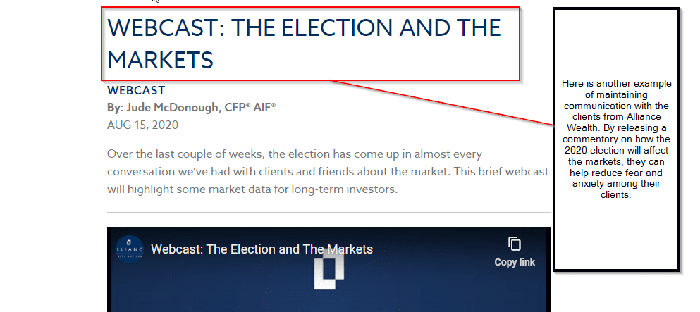 Financial advisors should not limit their content efforts to texts on a blog. Alliance Wealth is combining text (as seen above) with webcasts to evaluate current events and how they affect the market. By combining various content formats, they provide options for their clients.