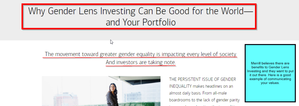 Here is Merrill Private Wealth Management affirming that gender lens investing can be a good thing for the world and an investor’s portfolio. Reading the article and their CIO’s (Chief Investment Officer) statement, you understand that this is important to them – something they desire more investors to pursue.